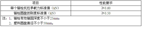 金属螺钉应采用不锈钢或经过表面防腐处理的金属制成,塑料钉和带圆盘的塑料膨胀套管应采用聚酰胺(polyamied6、polyamide6.6)、聚乙烯(polyethylene)或聚丙烯(polypropylene)制成,制作塑料钉和塑料套管的材料不得使用回收的再生材料。其技术性能指标应符合表3.2.16-1的要求。