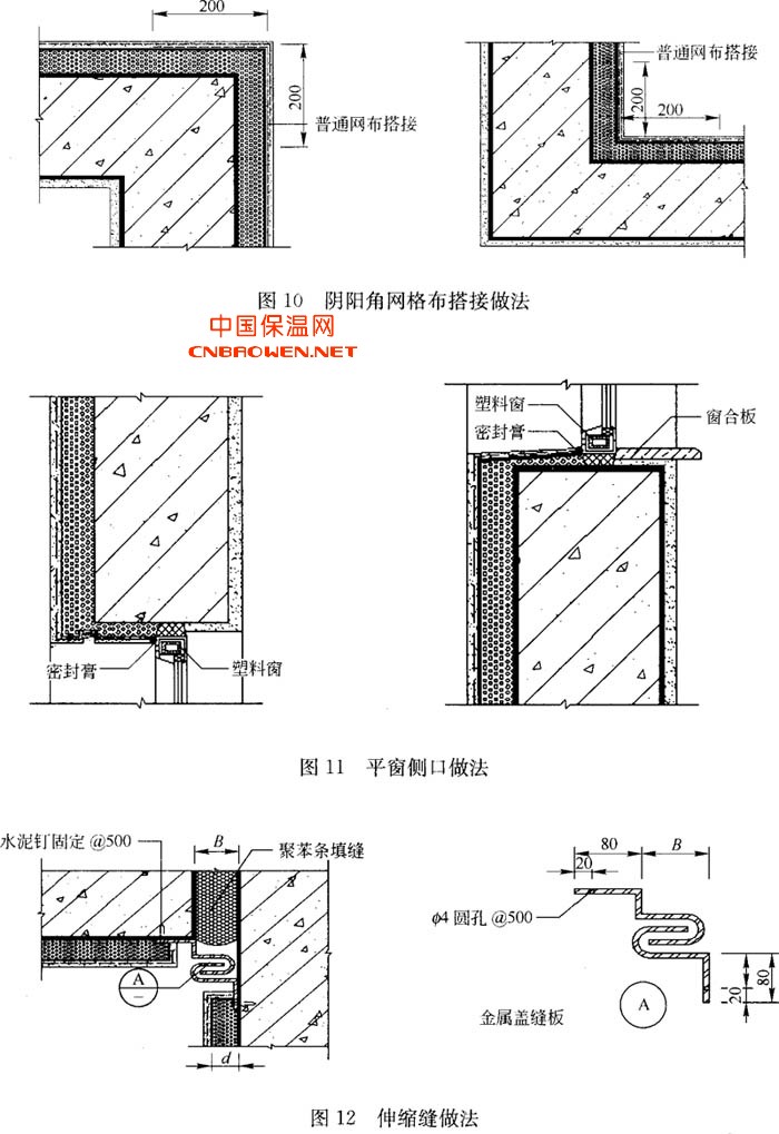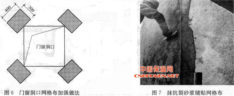 耐碱网格布长度不大于3m,尺寸事先裁好,网格布包边应剪掉。抹抗裂砂浆时,厚度应控制在3~4mm,抹宽度、长度与网格布相当的抗裂砂浆后应按照从左至右、从上到下的顺序立即用铁抹子压人耐碱网格布。在窗洞口等处应沿45o方向提前增贴一道网格布(400mmX 300mm)。耐碱网格布之间搭接宽度不应小于50mm,严禁干搭接。阴角处耐碱网格布要压茬搭接,其宽度≥50mm;阳角处也应压茬搭接,其宽度≥200mm。耐碱网格布铺贴要平整,无褶皱,砂浆饱满度达到100%,同时要抹平、找直,保持阴阳角处的方正和垂直度(见图6)。