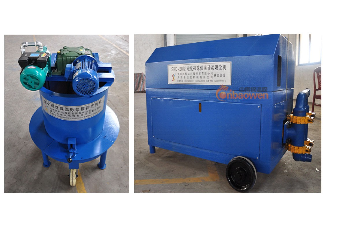 玻化微珠保温砂浆是一种无机保温砂浆,其采用玻化微珠为轻骨料,具有防火性能A级、无空腔、强度高、保温隔热性能好、耐久性强等优点,其缺点是导热 系数偏高,容重偏大。本文所说的新型玻化微珠保温砂浆是在普通玻化微珠保温砂浆的基础上,通过合理的配比,再加入发泡技术,改善其导热系数偏高,容重偏大 的缺点。经过机械搅拌、发泡、喷涂一体化技术(如图4),玻化微珠保温砂浆的导热系数可降低到0.05W/(m·k),强度可达到0.3Mpa以上。利用 该设备喷涂发泡玻化微珠保温砂浆具有以下特点: