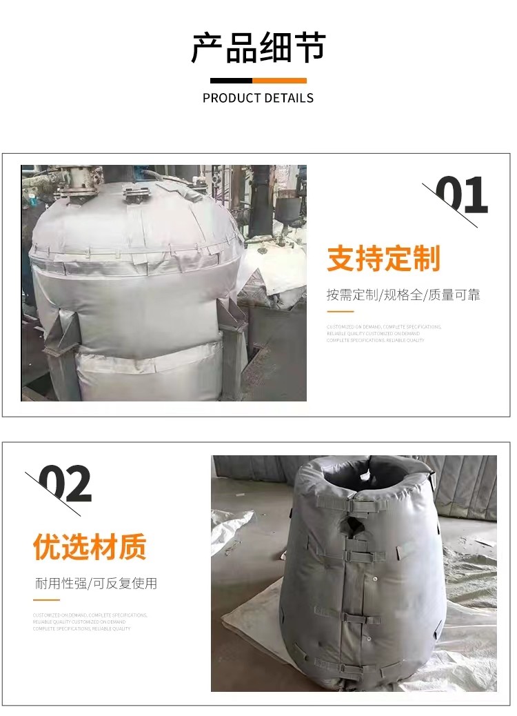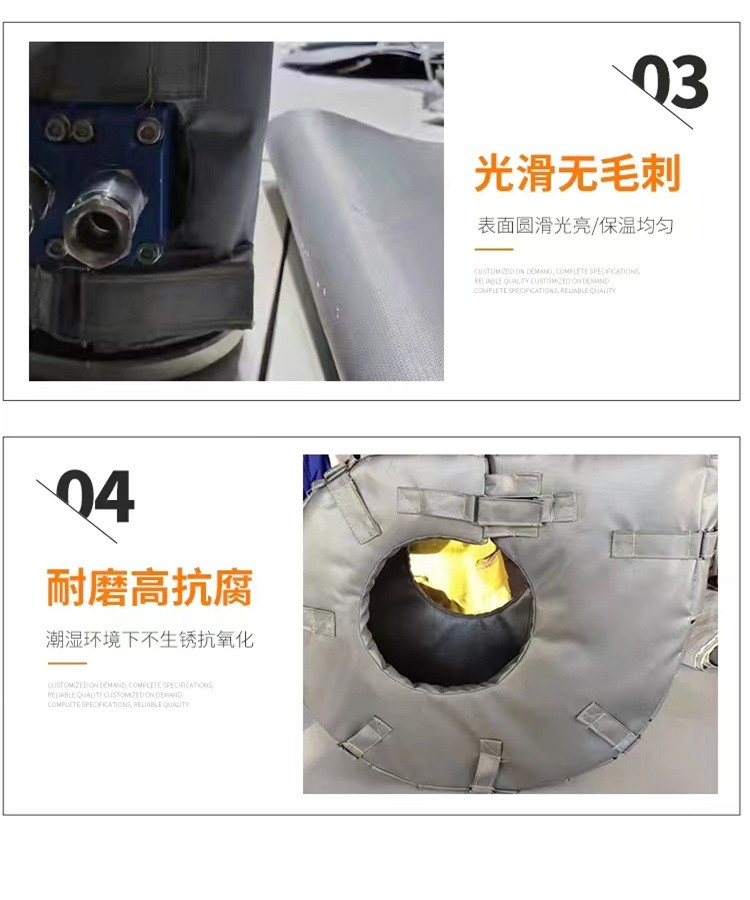 二、活动保温套,新一代绝热保温产品,它采用耐高低温、防火保温材料;有内衬、中间保温层,外保护层三层组成,根据管道或设备的具体形状设计加工而成。它是目前高档的管道、没备绝热保温材料。它可应用在不同温度,不同形状的管道和各种冷热没备的绝热保温。对于要经常拆卸、维修保养、清洗的管设备尤为适用。一面市,就受到业内人士的重视与青睐。广泛应用于石油化工、电力、冶金、造纸、油田等行业。